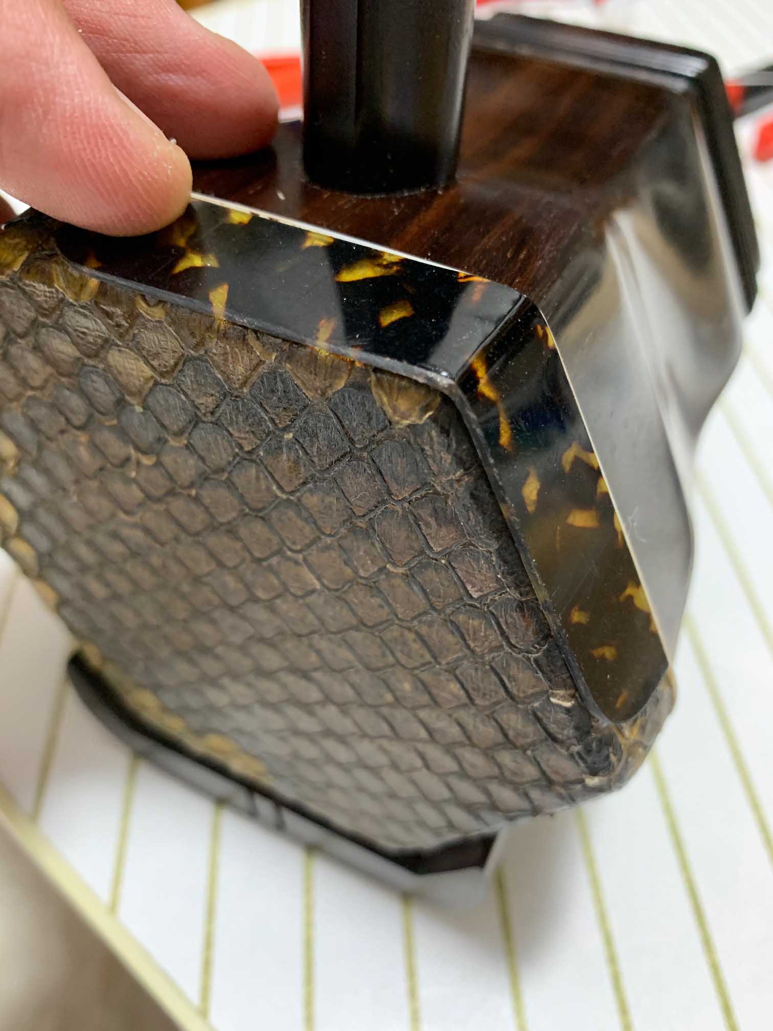 デンペン自体の反りは熱を加えれば修正できるのですが、二胡に接着された状態では本体への影響があり熱を加えられないため、安全をみて交換をおすすめ致しました。
