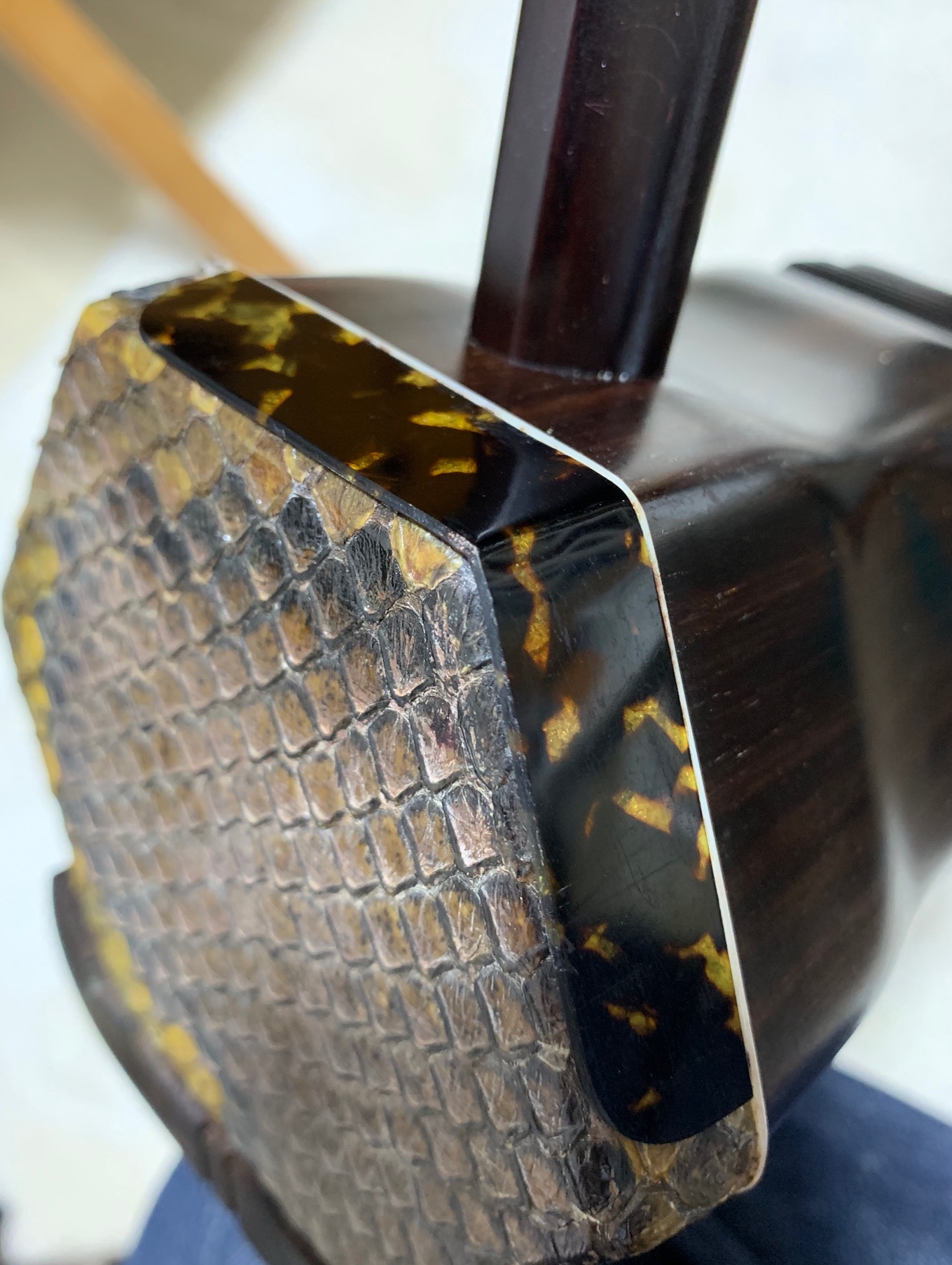 デンペンは、蛇皮の肩部分が弓との摩擦によって摩耗することを防ぐもの。蛇皮の身代わりになって、すり減ってくれるものですね。