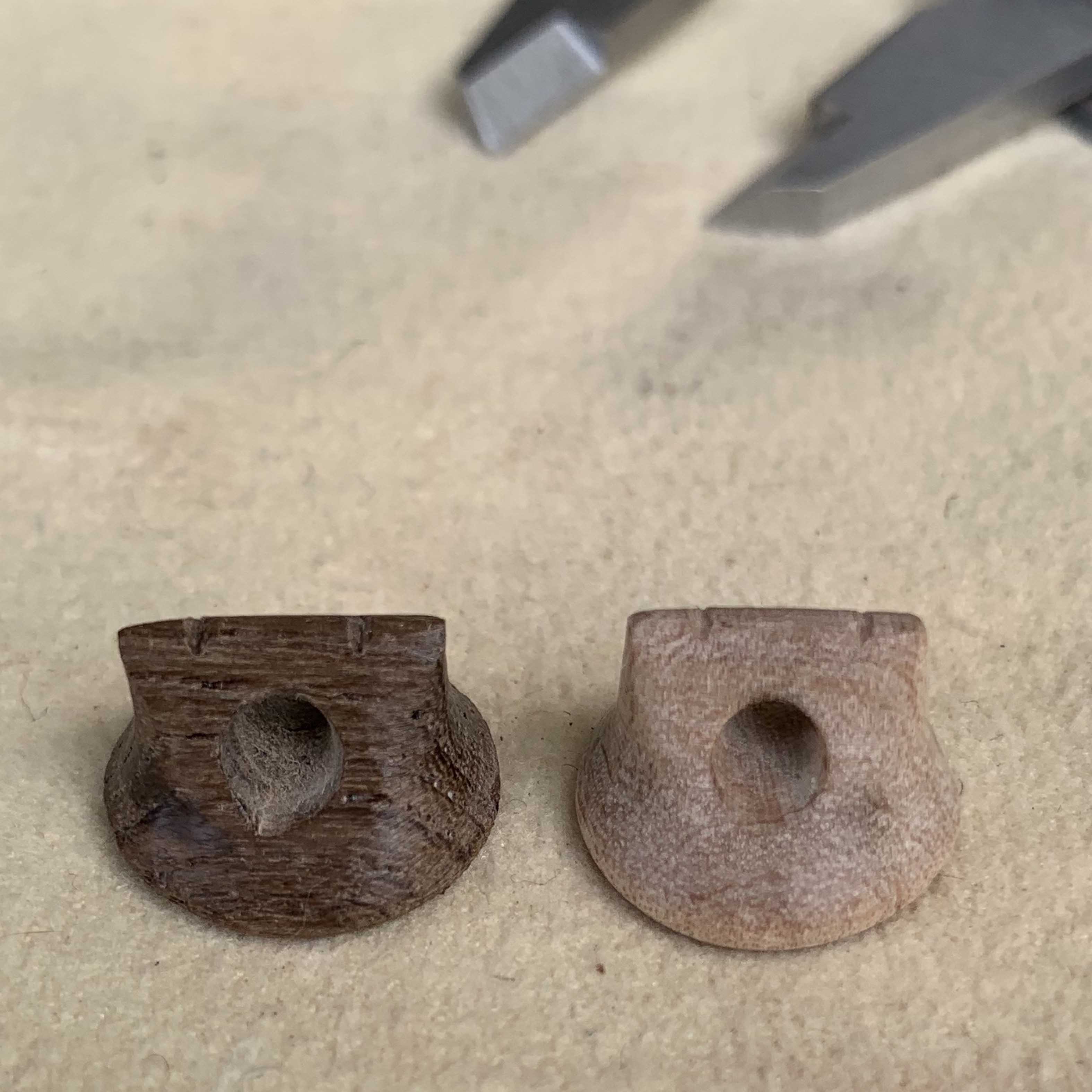 また、駒のオーダーメイド(特注)も行いました。駒選びは、今回のように試奏して選んで頂くのがベストです。このたびは楽器をお預かりし、楽器に合わせて駒のチューニングまでできたので、バランスよく音量もアップし、駒の材質(今回使用材料:◆イタヤカエデ柱材、◆神代ケヤキ)の特性からくる、少し明るめのまろやかな音色・・・という感じに仕上げることができました。
