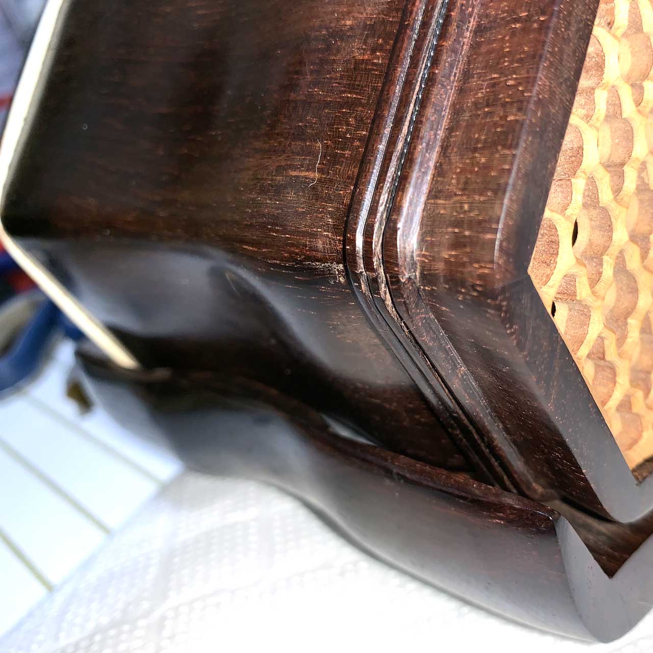 割れが大きく進行してしまった場合、木部は修理できても、「楽器」として修理できない場合は修理を引き受ける事ができません。