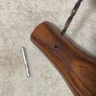 ピンは金属製軸の穴にピッタリはまらないと、木製取手を取り付けたときにガタガタ動きます。穴にピッタリはまるピンは無いので、自分で削り出します。