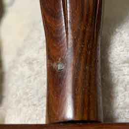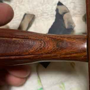 穴を埋めて表面を仕上げます。量産型の機械軸二胡では、ピンがむき出しのものが多いですが、この二胡はもともと丁寧に仕上げてありましたので、復元しました。