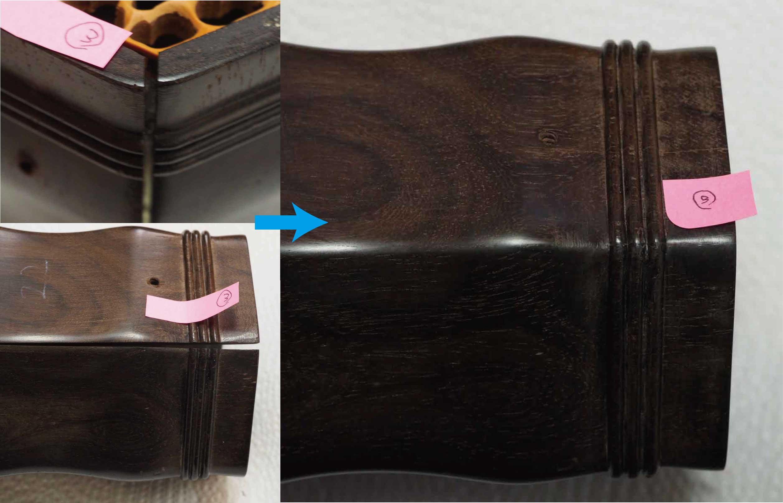 こちらは1本の楽器ですが、かなり長い期間ご愛用いただいてきたもので、各部の消耗のほか、接着部の剥離や頭折れなどの故障が蓄積したものでした。