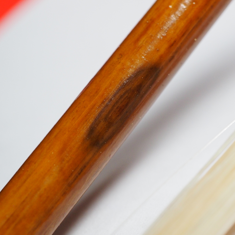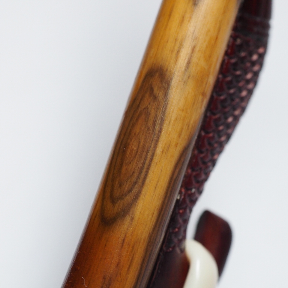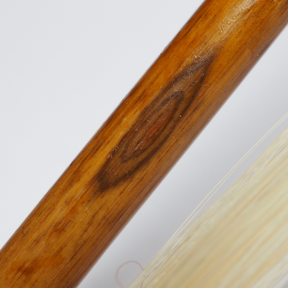 近年において、花紋と呼ばれる、鳳凰の眼のような模様がきれいに出る竹はほとんど採れず、めったにお目にかかれないそうです。そんな大変貴重な「極上の鳳眼竹」の弓を、王先生が所有するコレクションの中から1つ、私に送ってくださいました。これはもう、独り占めするより、お客様に広く見て触れてもらわないとバチが当たりますよ。ということで、店頭にて触れるようにしたいと思います。