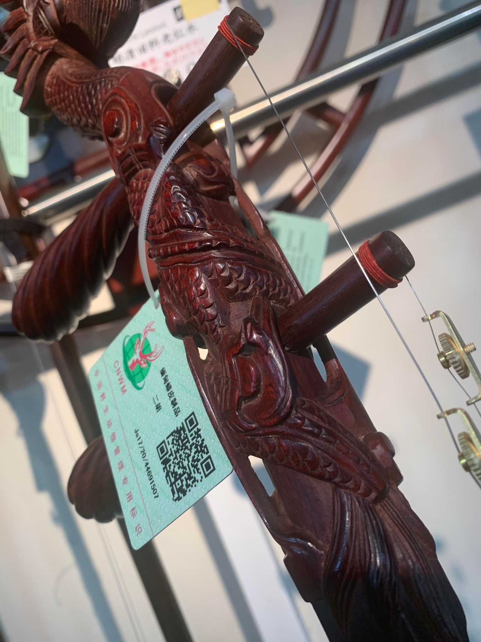 こちらの二胡は、「五星アフリカ小葉紫檀」がベースになっているものですが、ち密で精悍な彫刻をまとっただけあり、新品ながら、同一グレードの中でもよりよい材料が使用されており、他の新品の五星アフリカ紫檀を1~2年ほど弾きこんだような、身体にずーんと来る素晴らしい響き方をします。