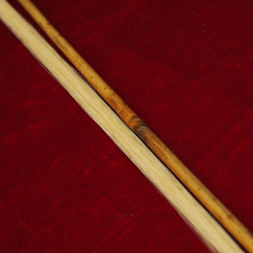 中胡弓は本来、長めに張った太い弦をしっかりと響かせるために、二胡弓と比較して竹は太く硬めで、弓圧を弓先演奏時までしっかりと残せるよう重心を先端側に置くため、長さが86cmと長めが標準です。